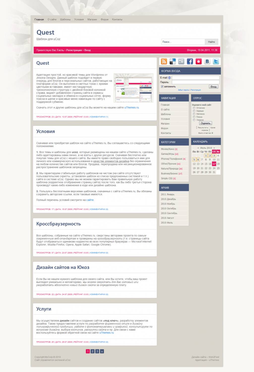 Оригинал нового шаблона сайта 3aka4ka для ucoz. Данный шаблон является адаптацией с DLE. Автор адаптации под ucoz - benq. Шаблон адаптирован качественно, в комплектацию архива входит также вид материалов.